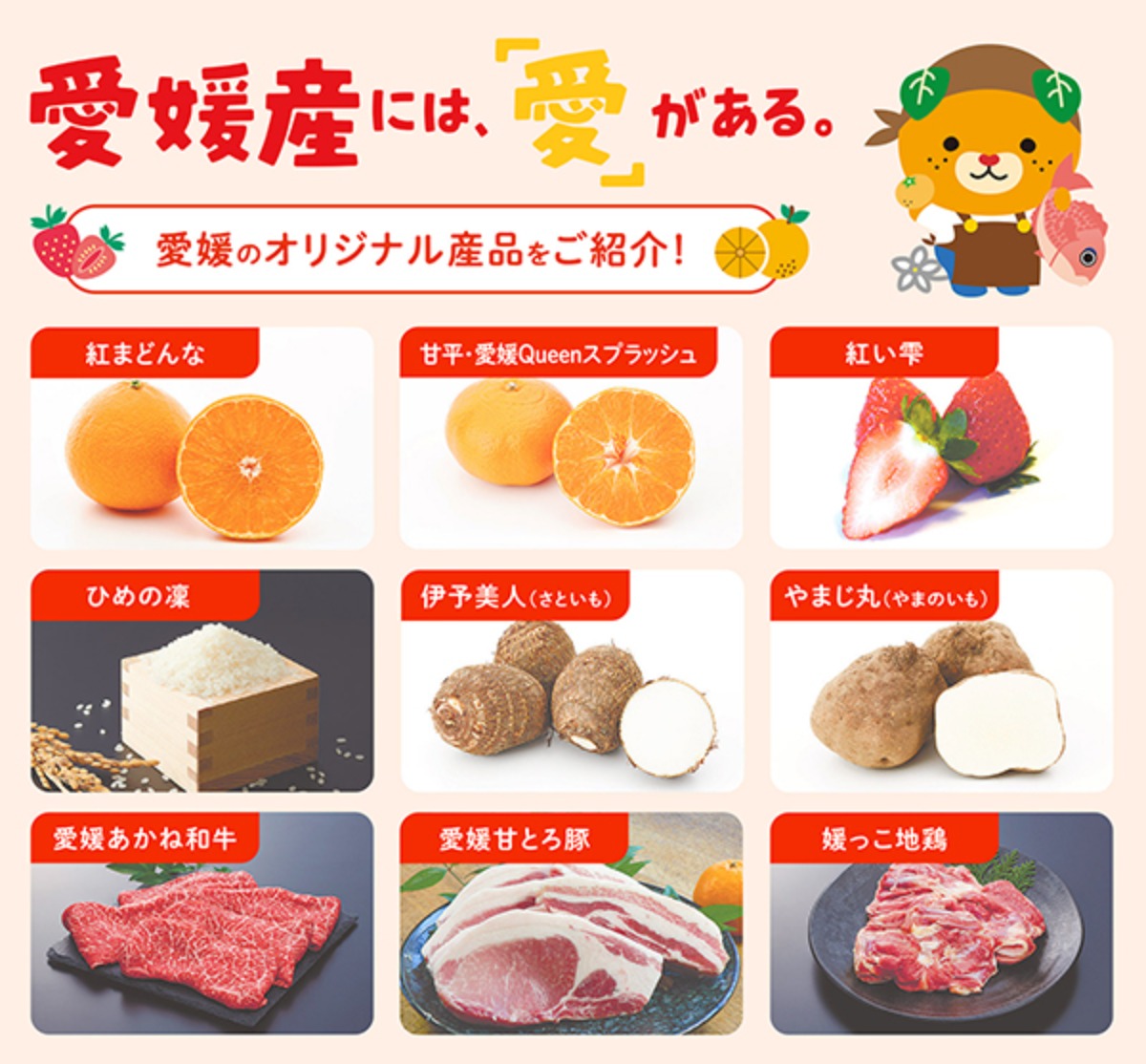 『「愛」あるブランド産品』をご存じですか? 愛媛のかんきつをはじめ、果物、野菜、水産物、畜産物、加工食品など、愛媛の農林水産物統一キャッチフレーズ「愛媛産には、愛がある。」を基本コンセプトに、知事を会長とする「えひめ愛フード推進機構」が認定した産品のこと。現在、50品目85産品が認定されています(令和7年12月末時点)。