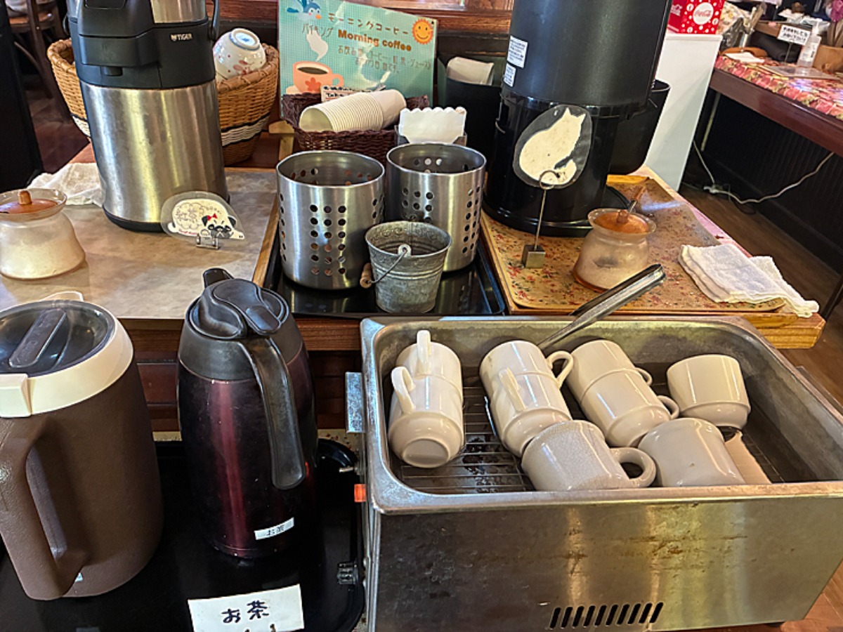 ガラスの入れ物に入ったアイスコーヒーや麦茶、冷水などもありました。