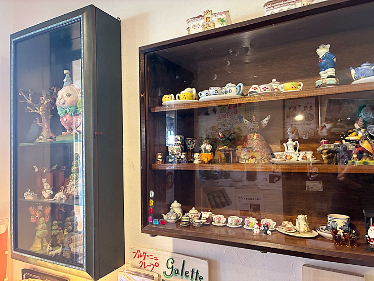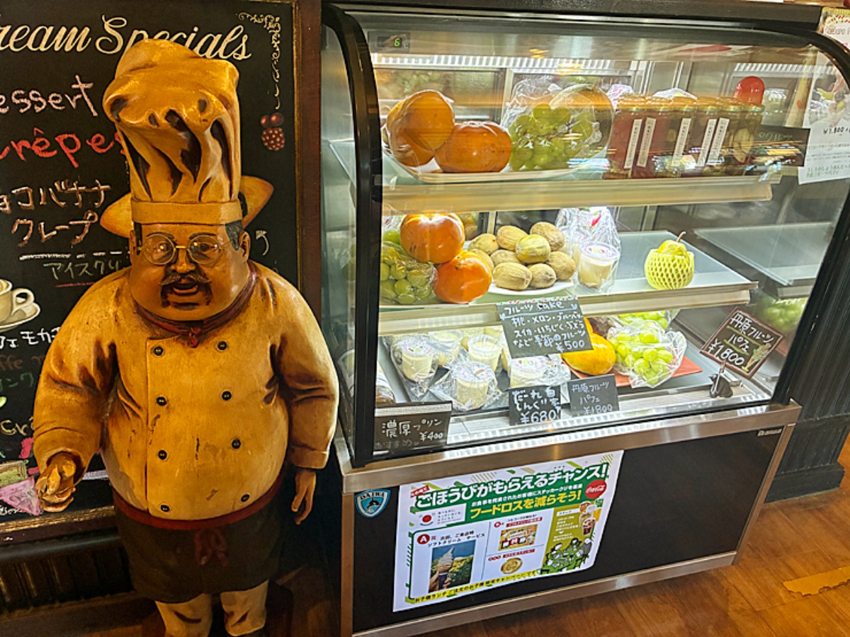 入り口から入ってすぐに目に入ったのは、ビンテージ感のある置き物とフルーツとプリンが並んだショーケース!まるで小さなケーキ屋さんのようです。