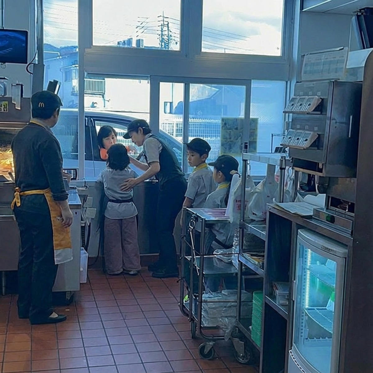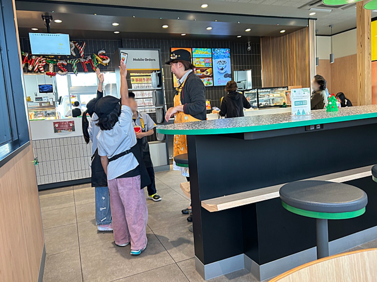 ちょうどお客さんも来て、ドライブスルーのお客さんに商品を渡すのもやらせてくれたみたい。