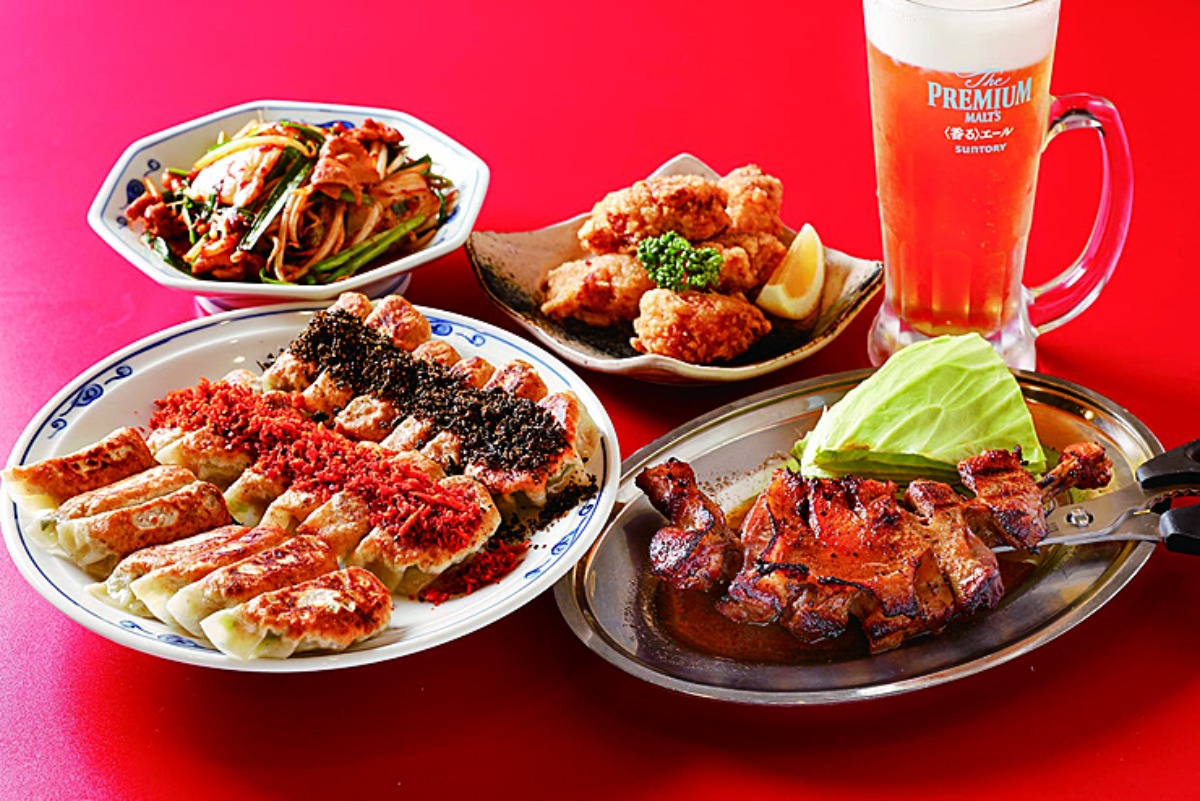 スパイスをブレンドした「赤・黒餃子」、おやとひなの2種類から選べる「骨付鳥足」も人気