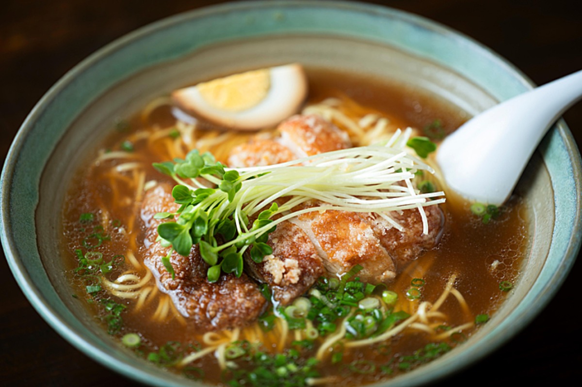 自家製の細麺に、豚骨・鶏ガラ・煮干し・昆布などでダシをとったスープを合わせ、揚げたての唐揚げをのせた一杯