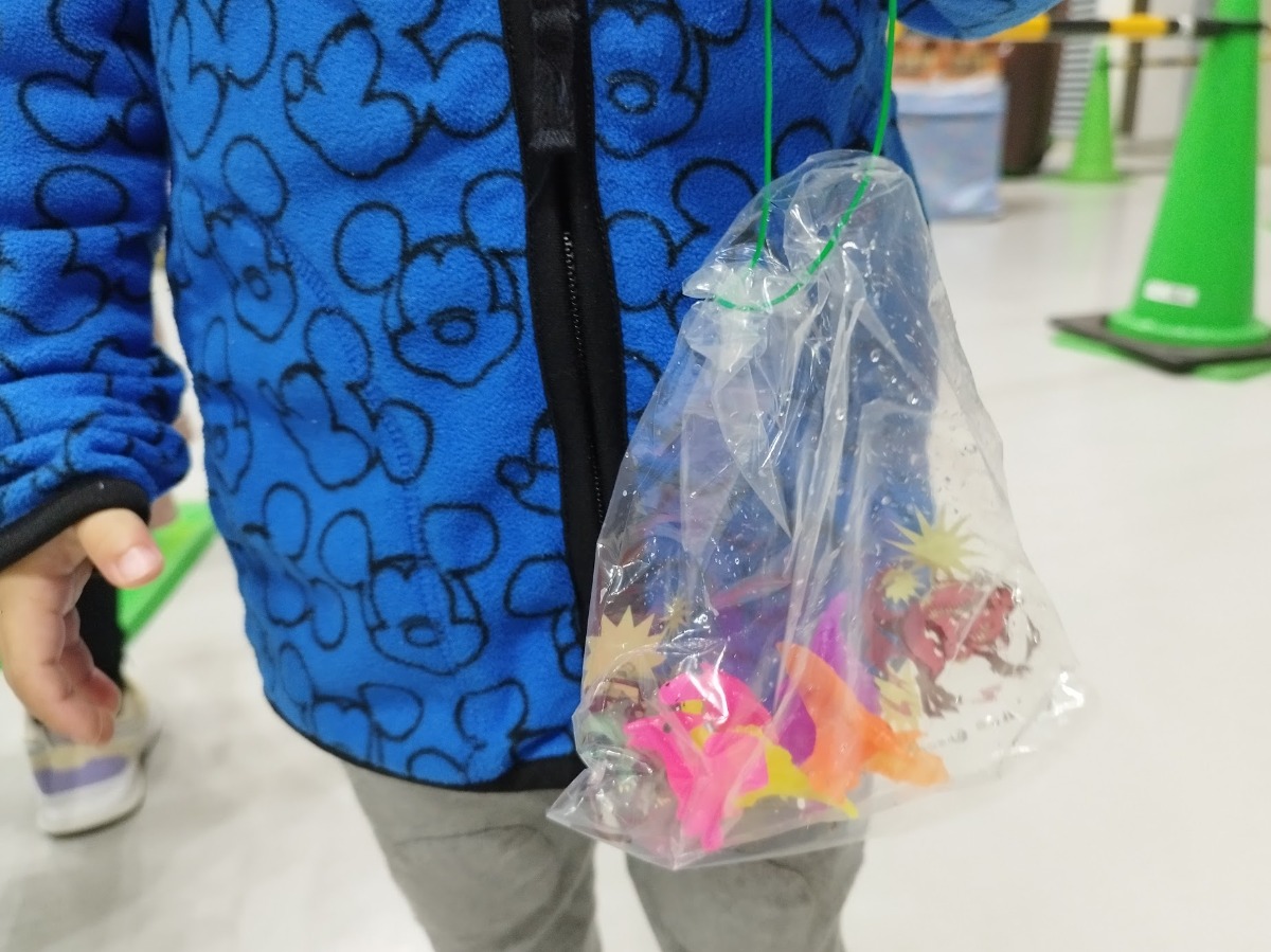 取れた中から5匹選んで持って帰ることができるとのことで、自分でゲットした恐竜の入った袋を自慢気に見つめている姿が印象的でした。
