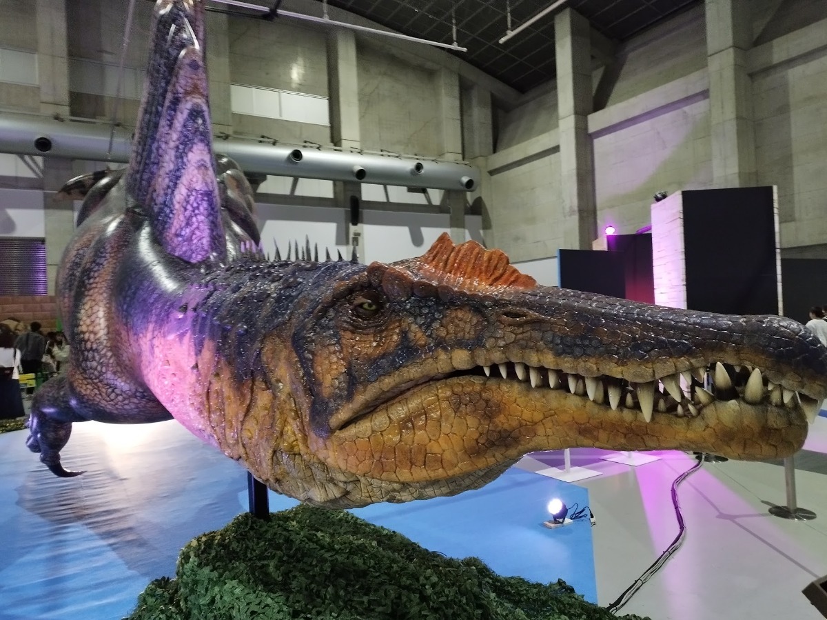 中でも多くの来場者の目を引いていたのは全長15メートル、水中で獲物を狙う姿を完全再現したスピノサウルスの展示。