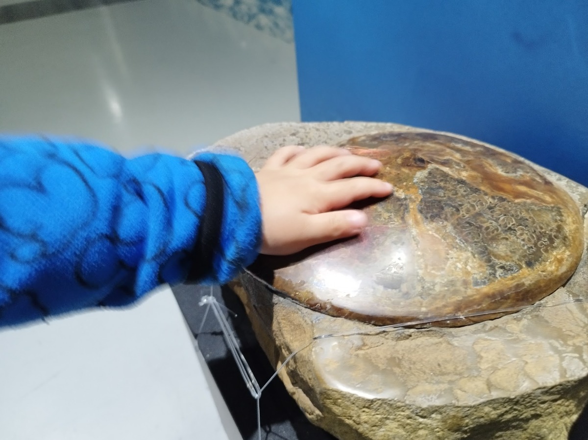 本物のアンモナイトの化石に触れる息子氏。