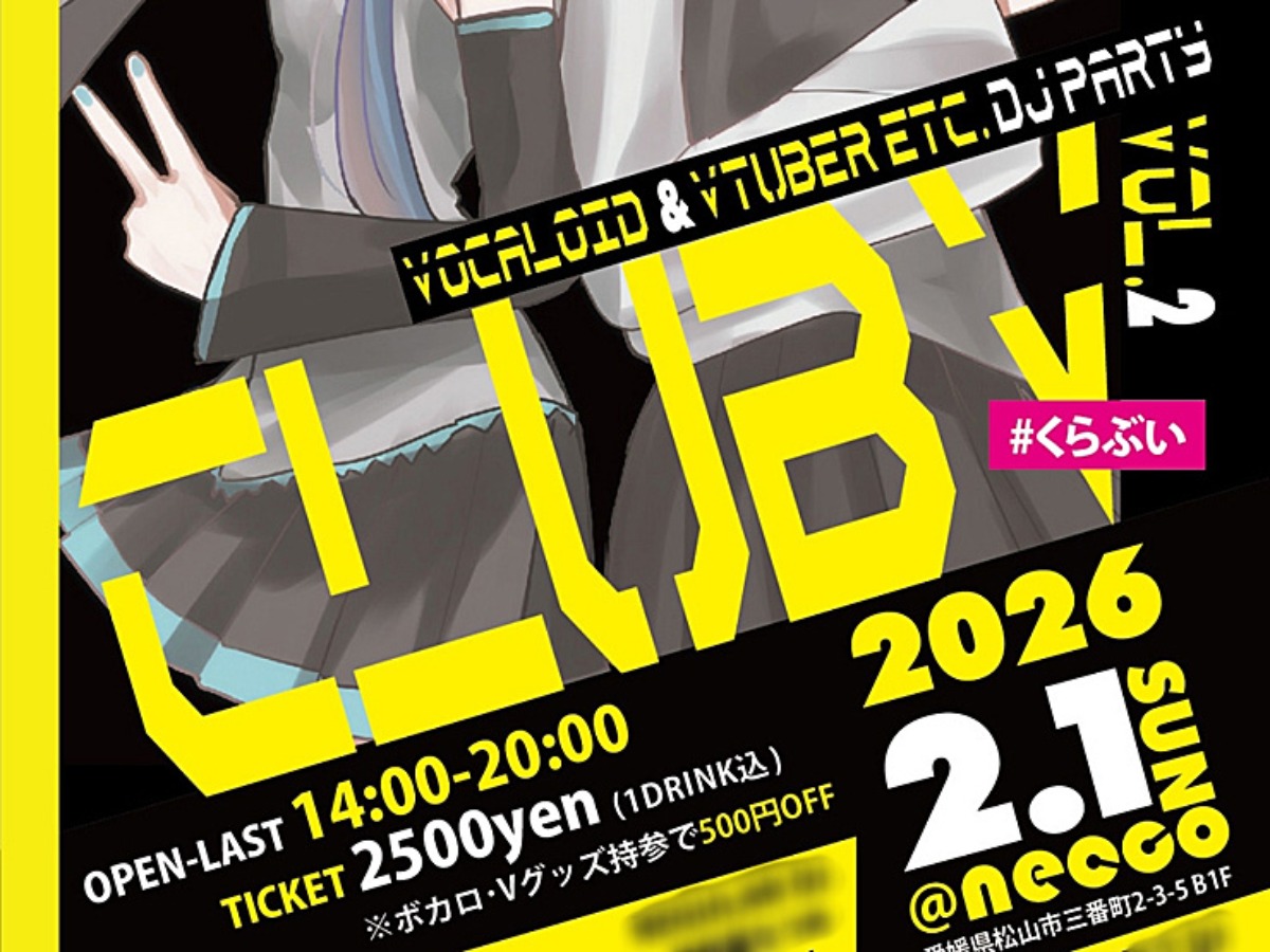 このイベントでは、初音ミクや最近人気の重音テトなどの人気ボカロ曲や、今注目のVTuberソングが次々流れるサブカルチャーファン必見のパーティです。