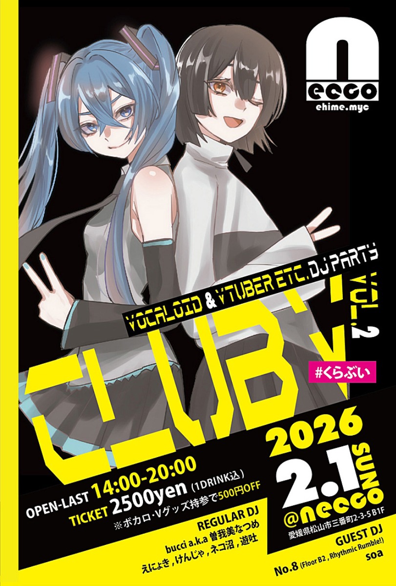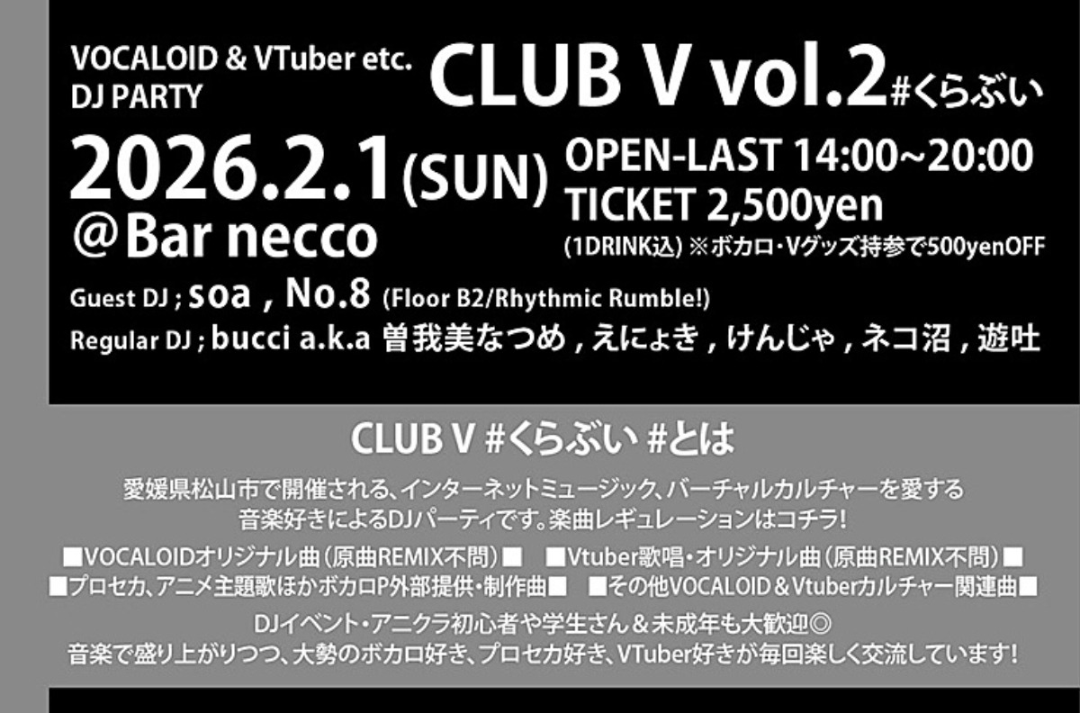そのうちのひとつが、2026年2月1日(日)のお昼に松山市三番町のBar neccoにて行われるDJパーティ「CLUB V vol.2」となっています!