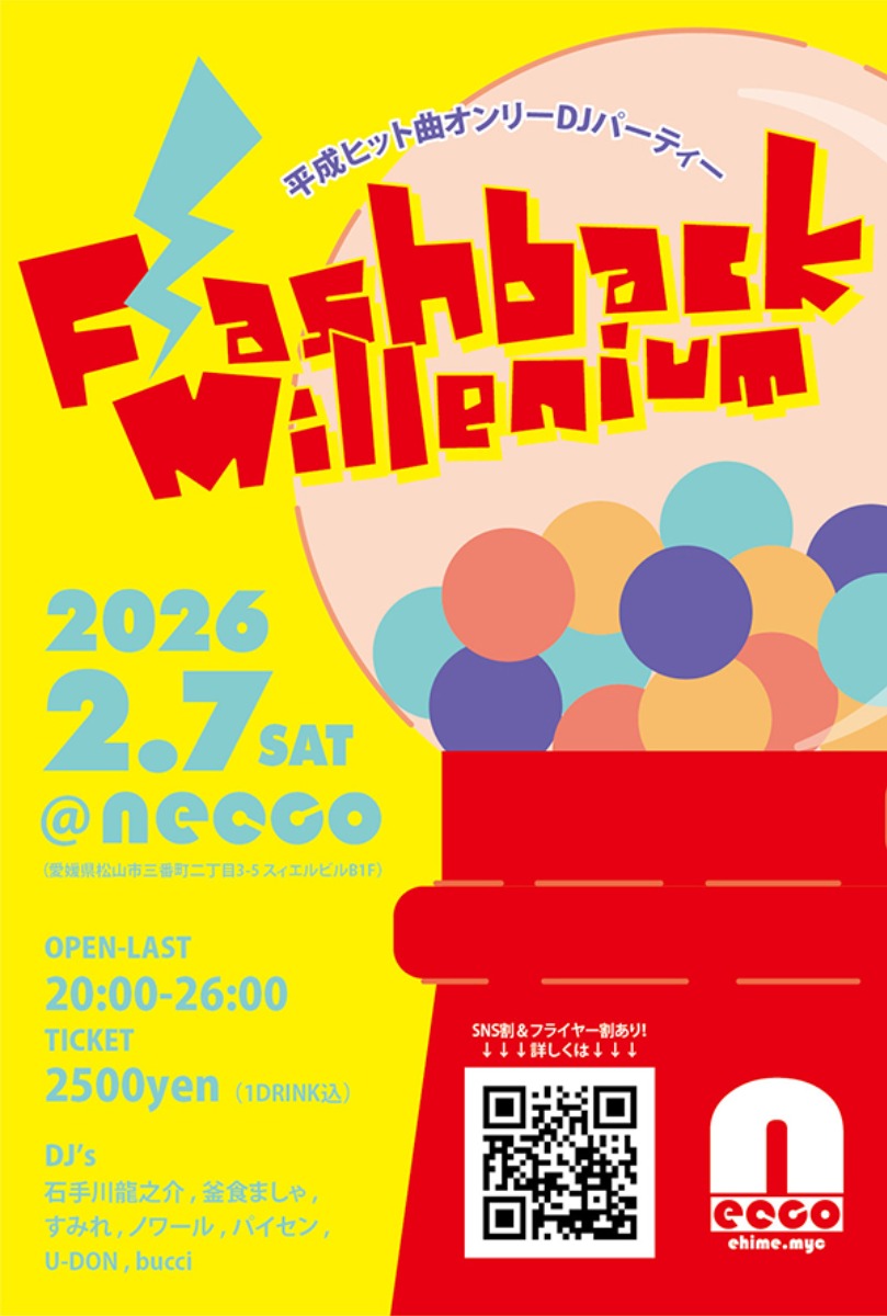 2026年2月7日(土)、松山市三番町のBar neccoにて、平成のヒットソングだけが流れるDJイベント「Flashback Millennium vol.5」が開催されます。