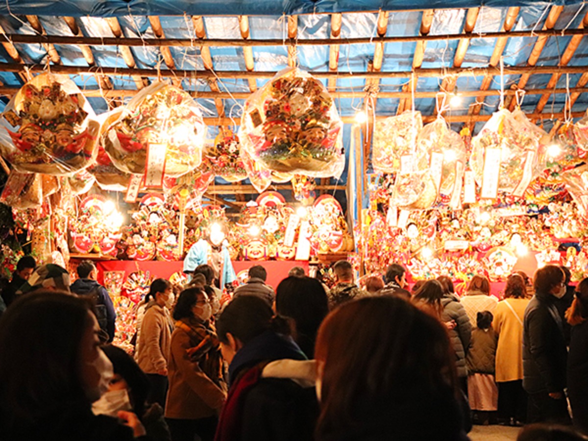 縁起物の種類は「熊手」「ザル」「俵」「宝船」「扇」の5種類。