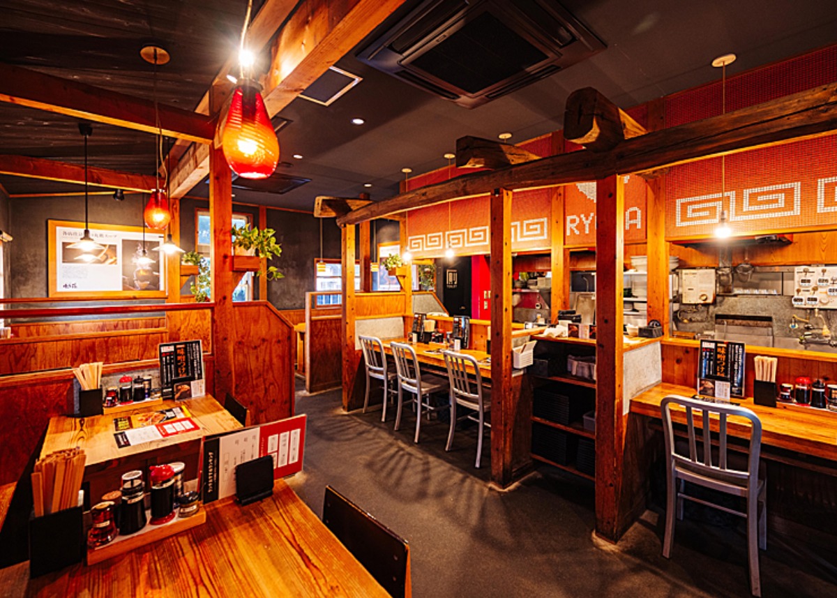 店内はカウンター席とテーブル席を用意。広々とした駐車場も完備