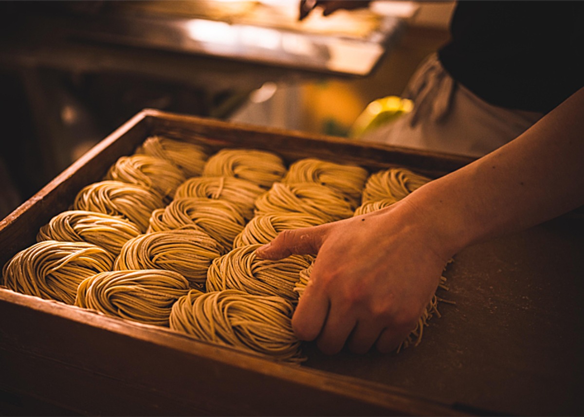 喉ごし抜群の自家製麺は、100分の1ミリ単位で管理し、モー ツァルトを聴かせ桐箱で3日間 熟成させるこだわりの独自製法!