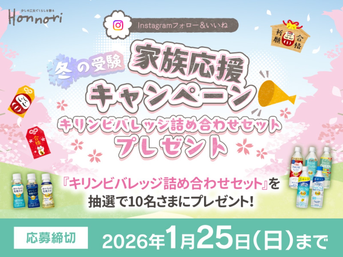 フジのWEBマガジンHonnori (ほんのり)のインスタグラム公式アカウントをフォローして、「冬の受験家族応援 キリンビバレッジ詰め合わせセット」キャンペーン投稿に「いいね」すると応募完了!