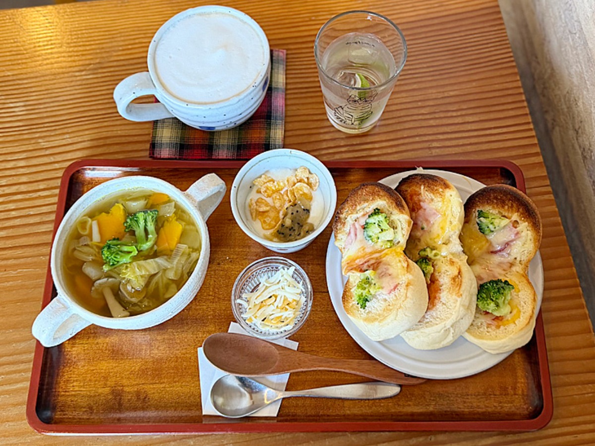 ピザパン、スープ、ヨーグルト、ドリンクがセットになった色鮮やかで、目でも楽しめるセットです。