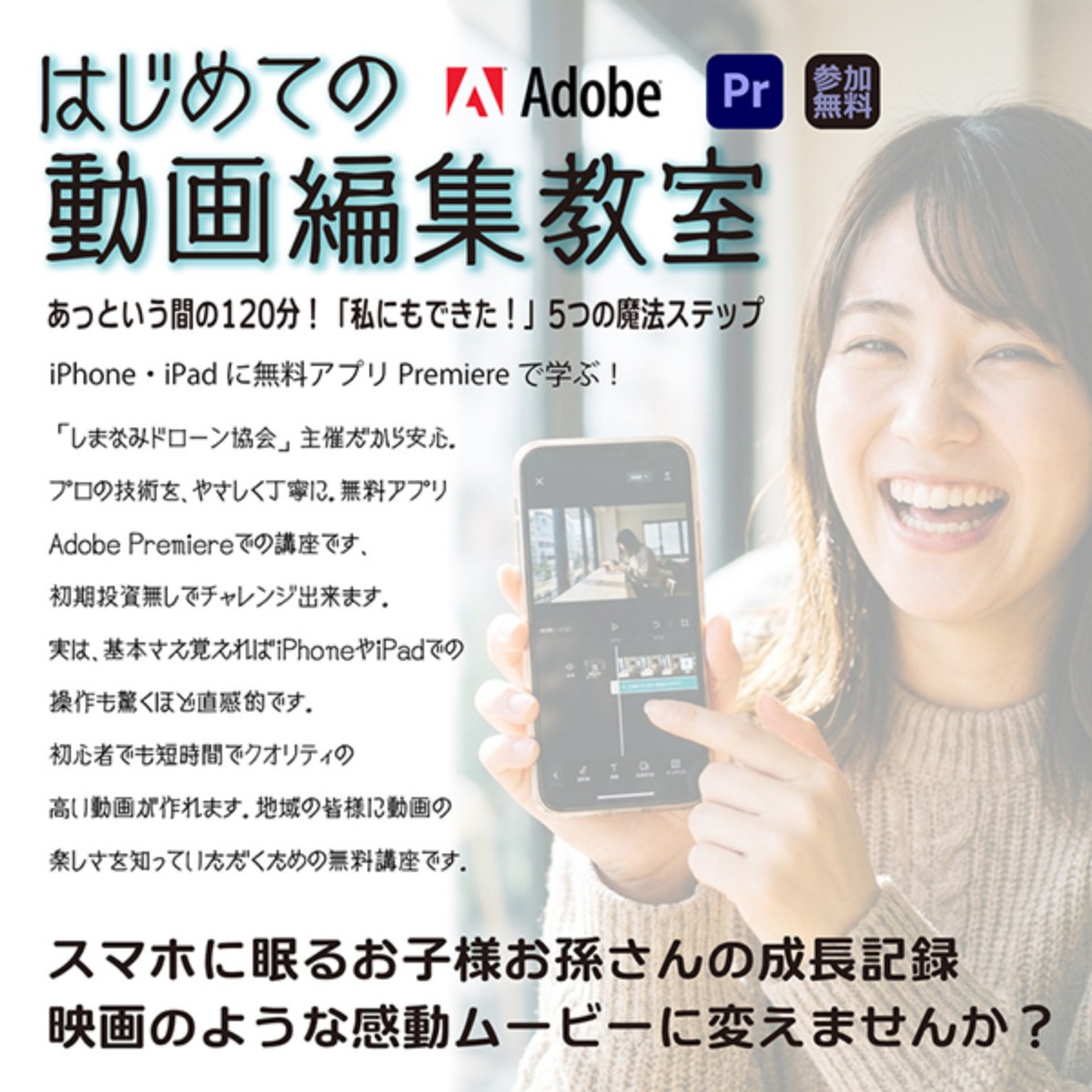 しまなみドローン協会が主催する「初めての動画編集教室」が、今治市のしまなみドローン協会で2026年1月21日(水)から23日(金)まで開催されます。