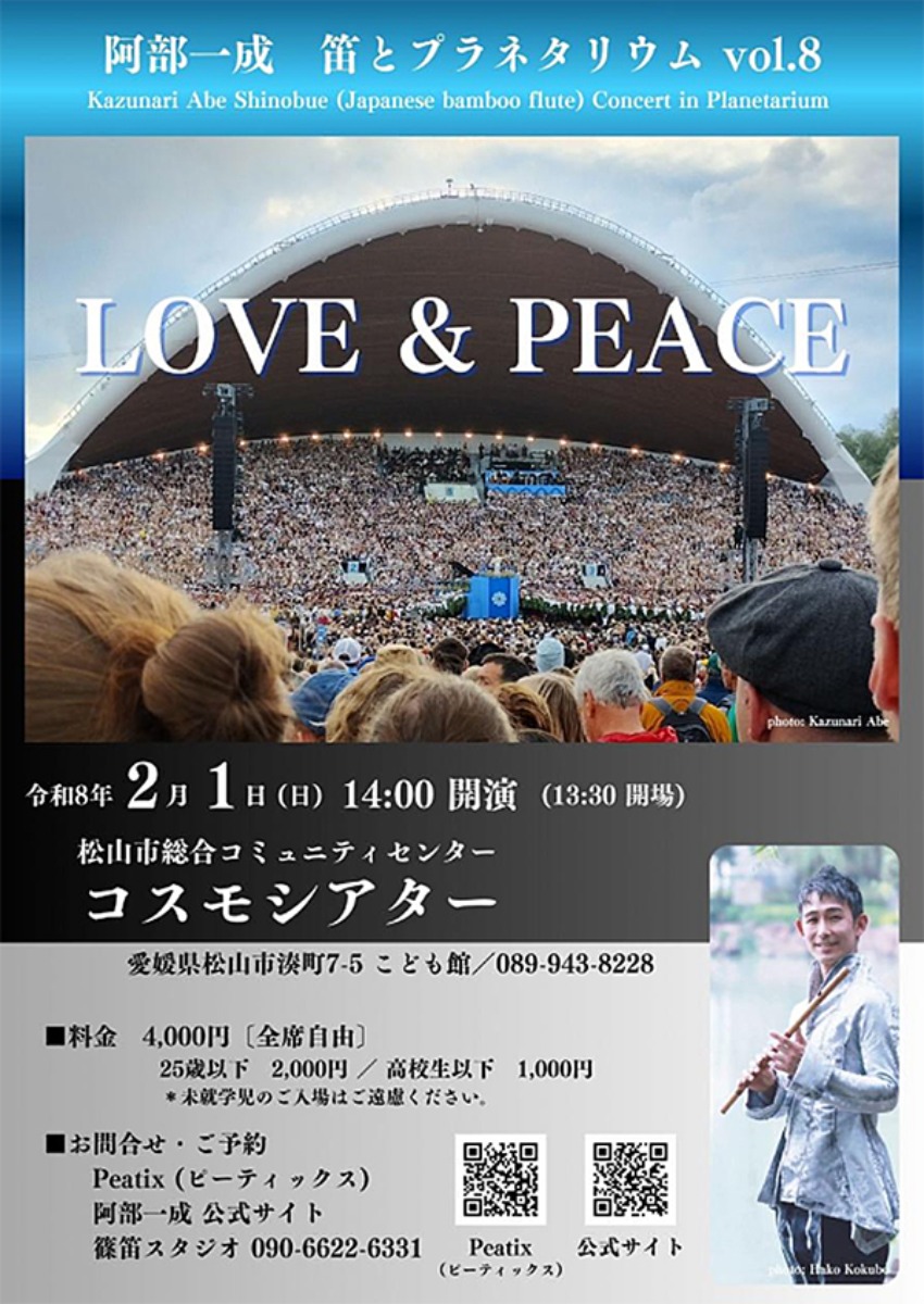 2026年2月1日(日)松山市総合コミュニティセンター コスモシアターにて「阿部一成 しの笛コンサート 笛とプラネタリウム vol.8 ~LOVE & PEACE~」が行われます。