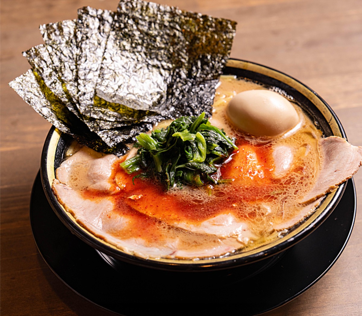 「特製豚骨醤油」に辛 味ニンニクダレをかけ、 深みのあるうま辛味に 変化。ご飯も進む!