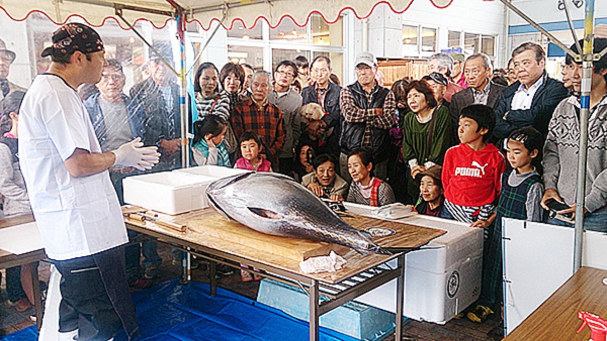 毎回大好評なのは、迫力も満点のマグロ解体実演ショー!
