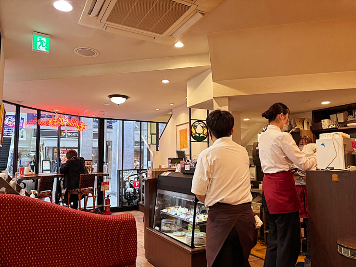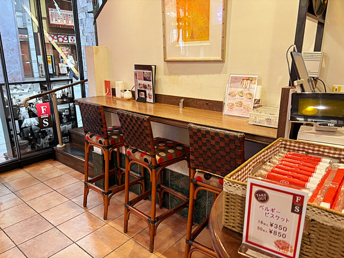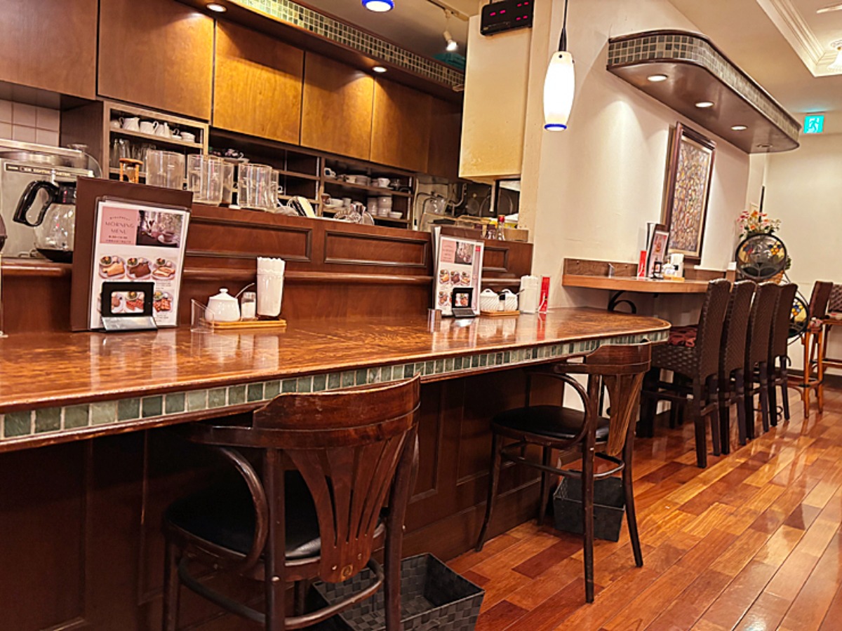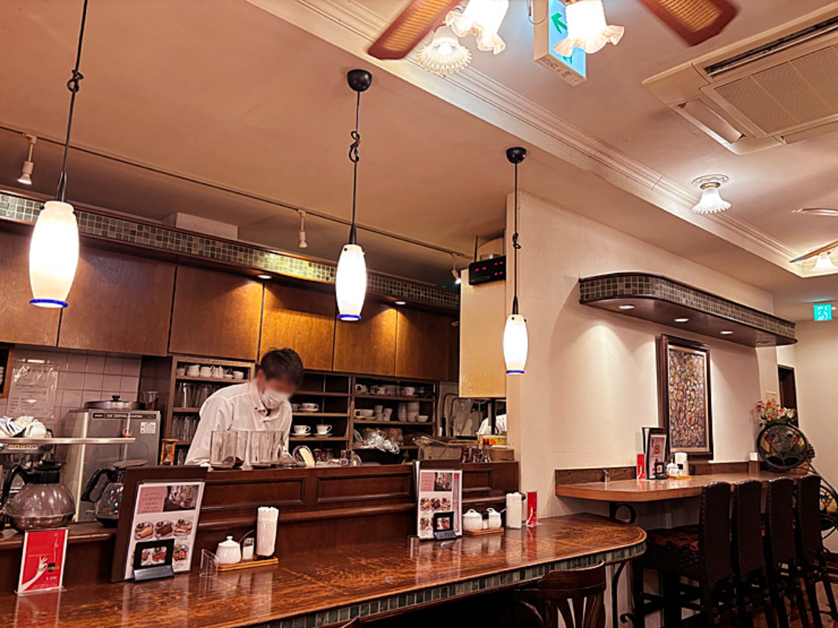 店内はレトロな空間が広がり、カウンター越しの景色も素敵です。