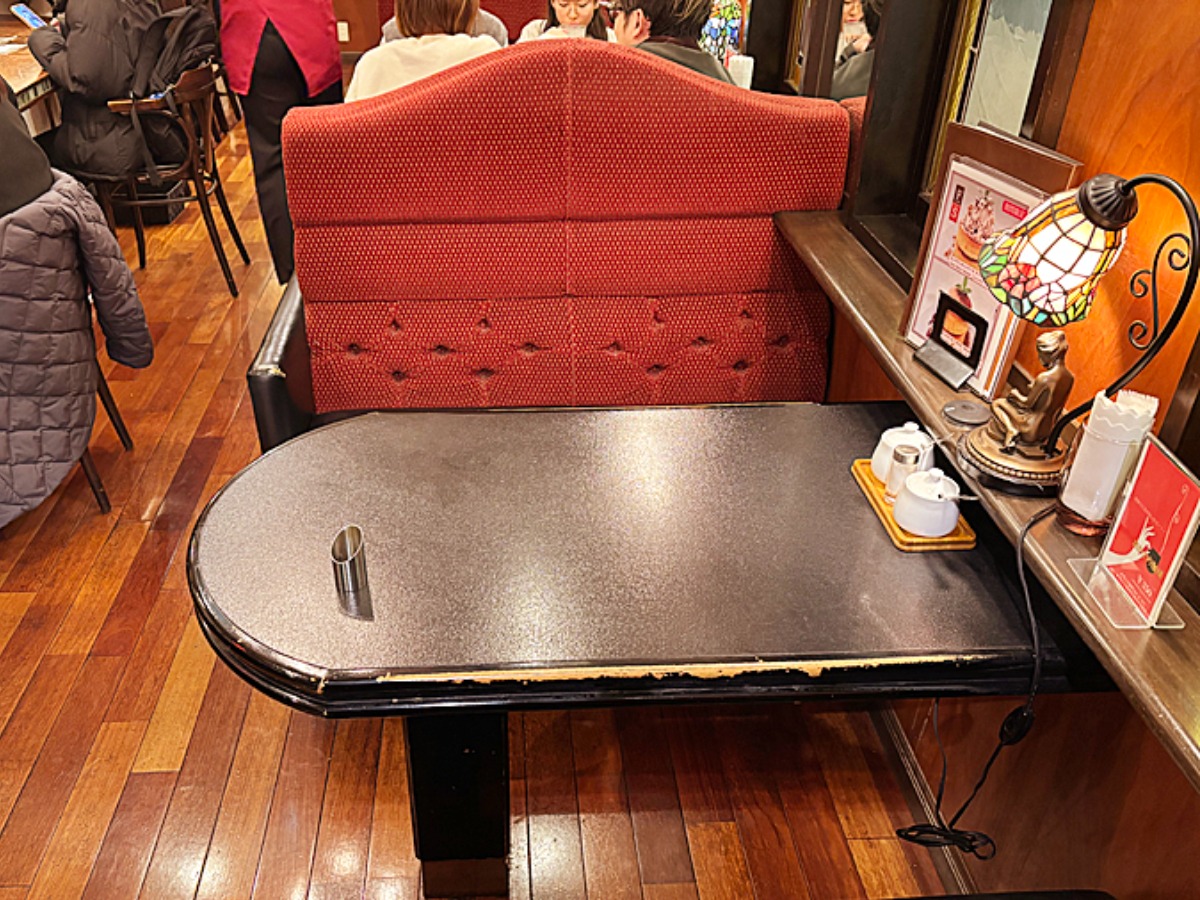 クラシックな赤いソファーと味わいのある木のテーブルがたまりません。