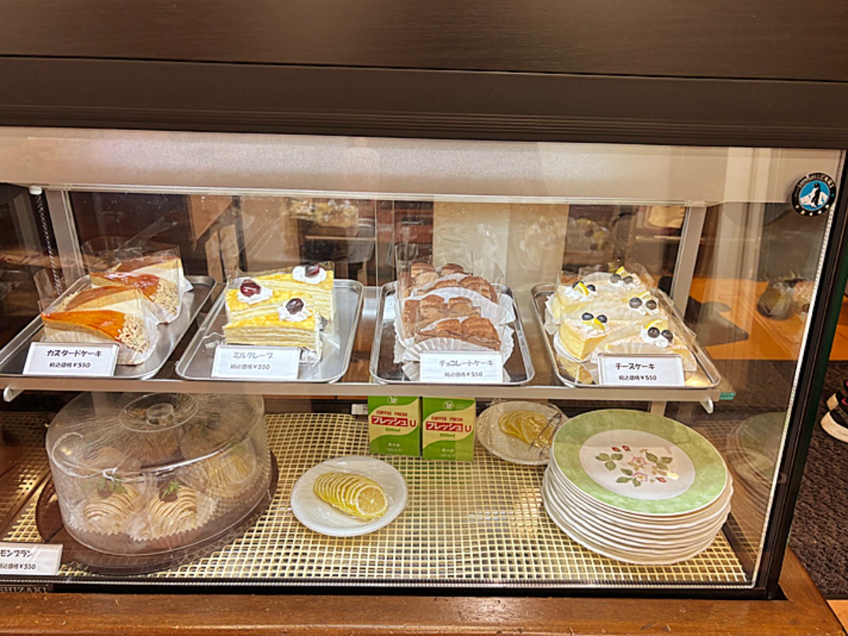 ショーケースにはカスタード、ミルクレープ、チョコレート、チーズ、モンブランが。
