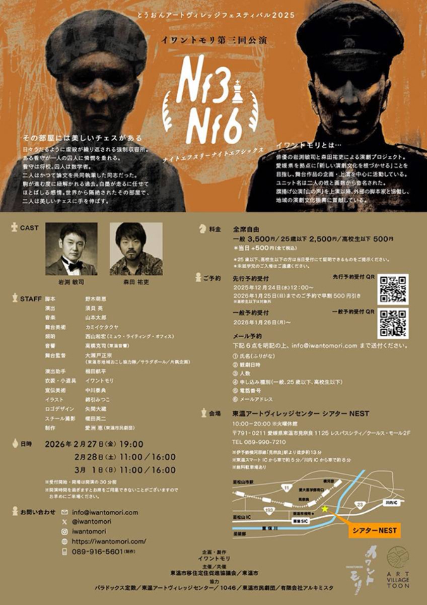 愛媛県東温市の東温アートヴィレッジセンター シアターNESTで、イワントモリ第三回公演『Nf3Nf6』が開催されます。
