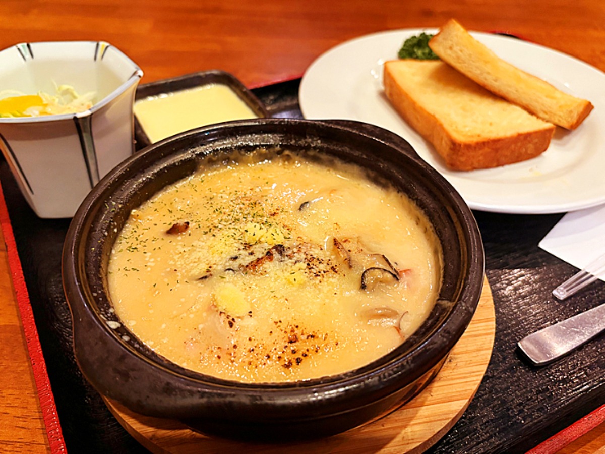 友人が注文した冬季限定「カキとキノコのクリームグラタン」があまりにも美味しそうだったのでパシャリ。