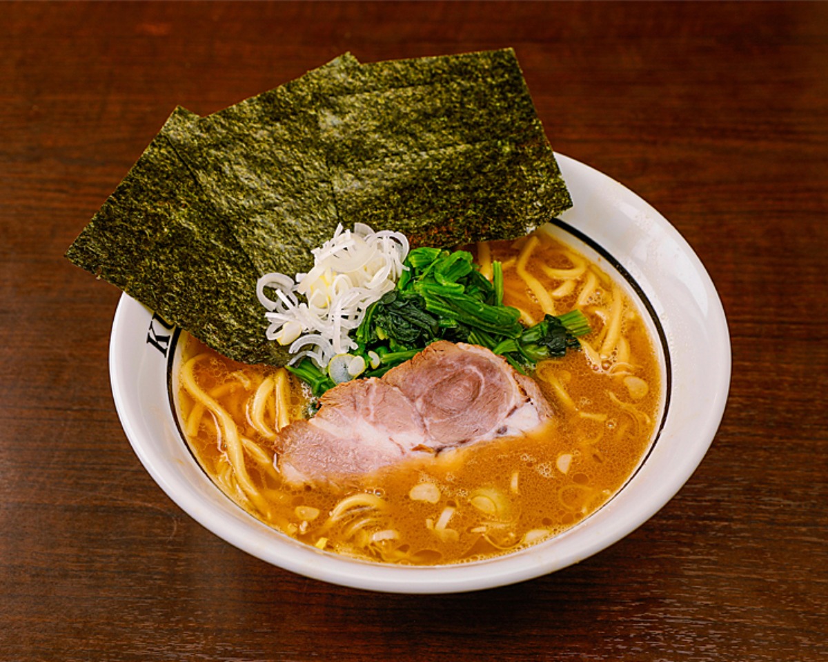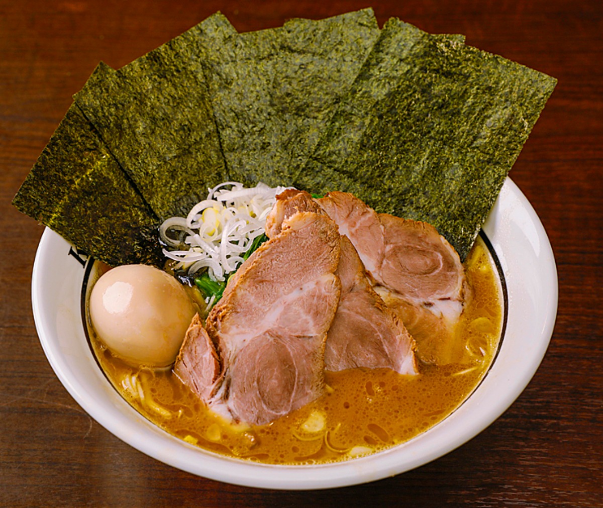 家系ラーメンに自家製 チャーシュー3枚、こだ わりの海苔5枚、味玉 付きで贅沢に