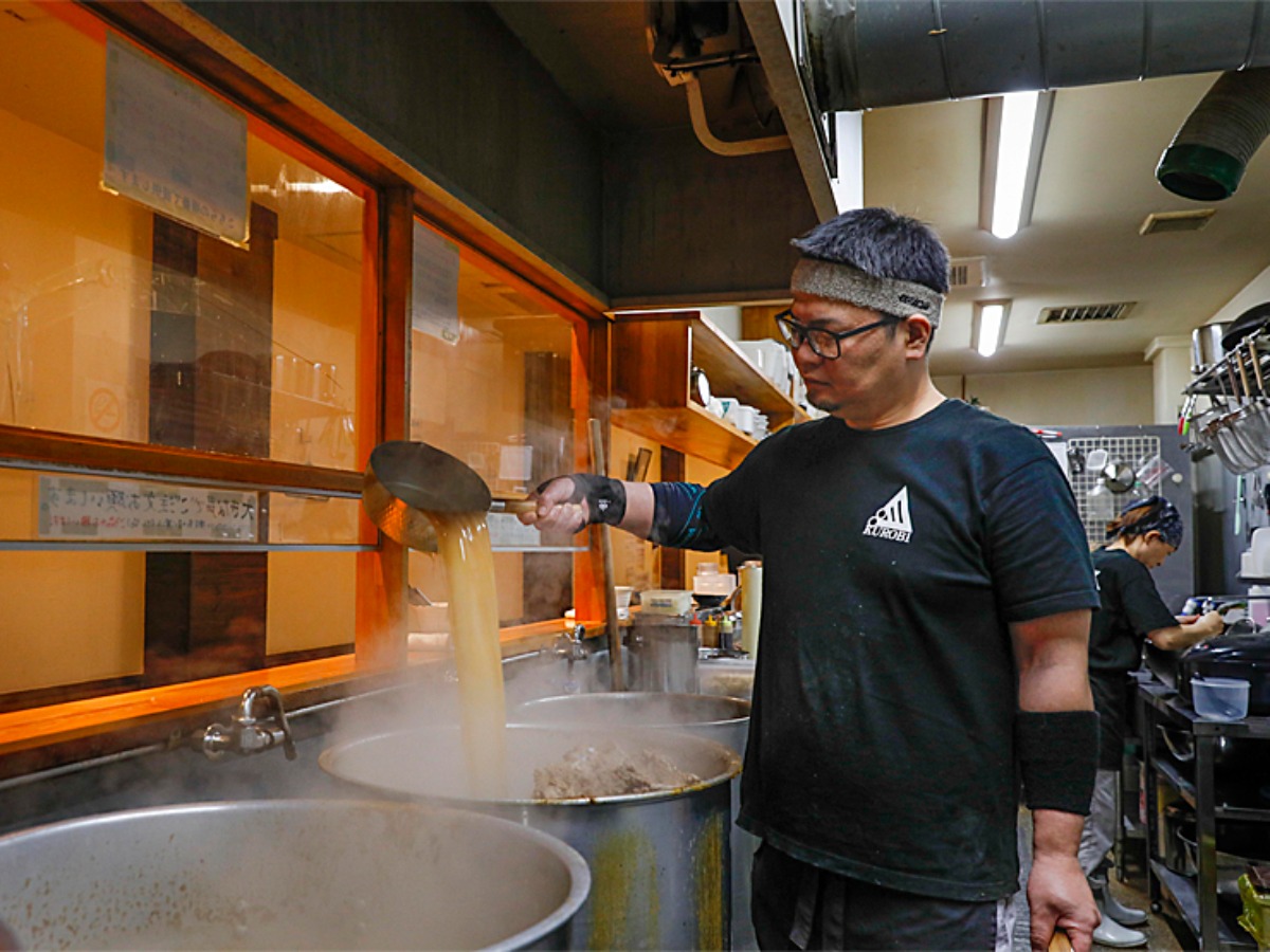 スープは前日のスープの継ぎ足しで味をのせていく。飲み干せるスープの理由は丹念な作業の連続にあり