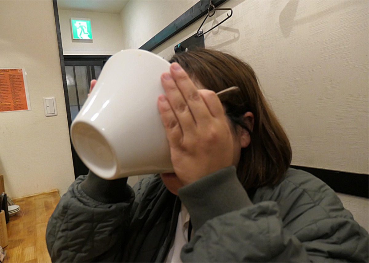 ▼レンゲでは追いつかず、丼ごとスープを飲み干すたんたん。無我夢中である