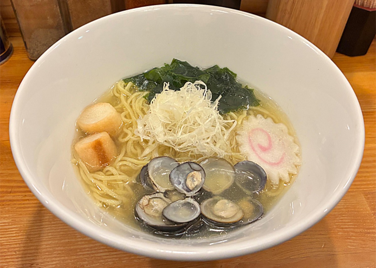 島根県宍道湖の生しじみをふんだんに使用した透明感のある黄金スープ。「浅草開 花桜」の卵麺を使用