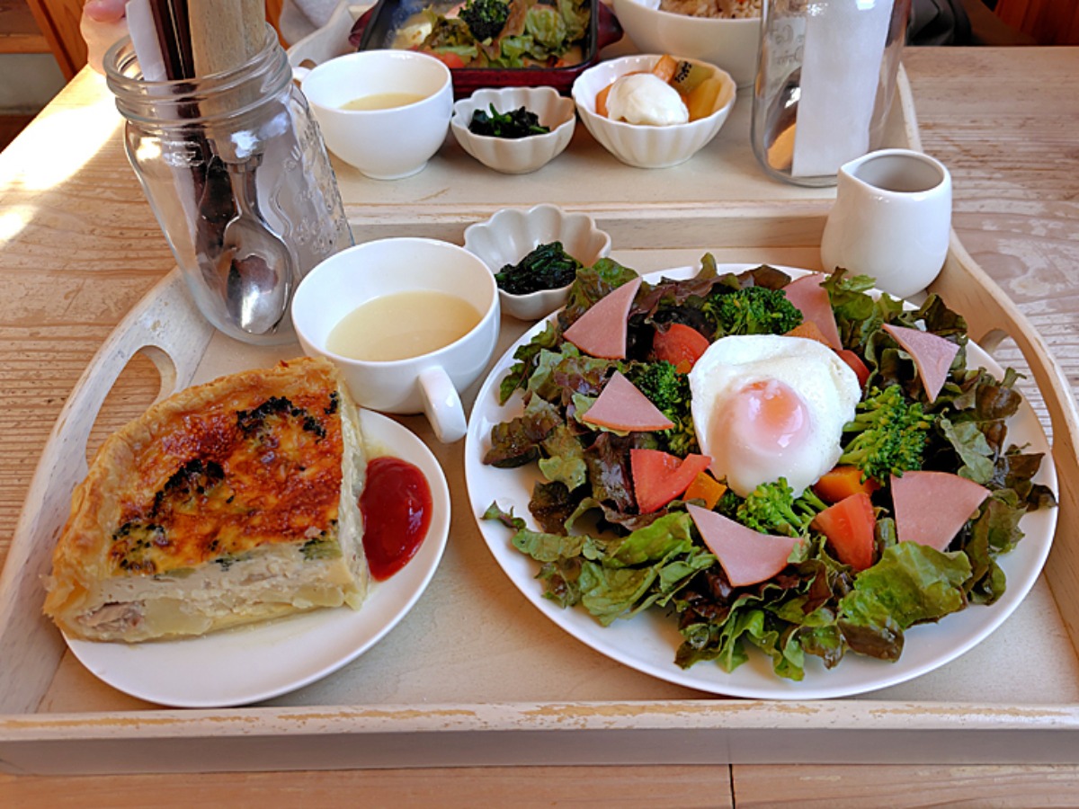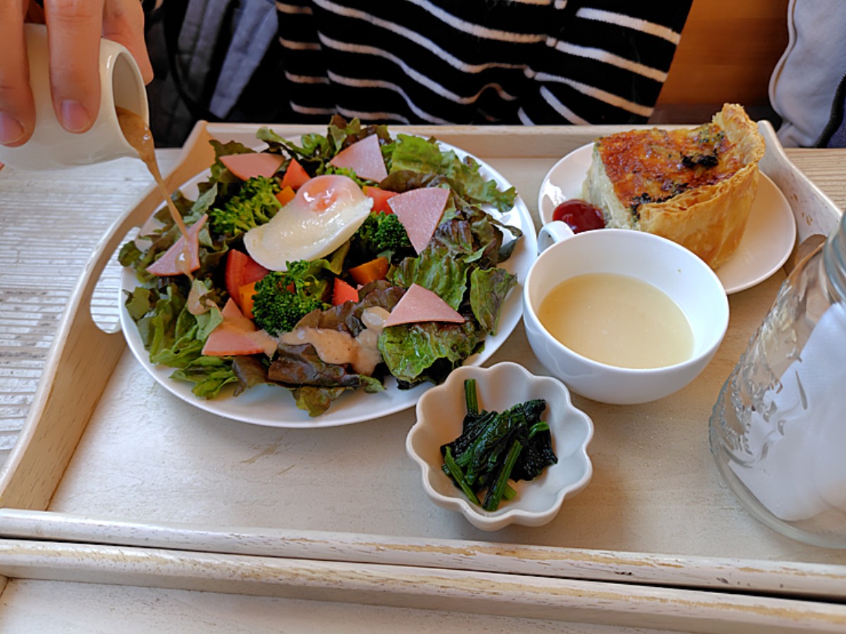 妹の注文したキッシュランチは、ブロッコリーとツナが入った厚みのあるキッシュと、フレッシュな生野菜のサラダ、ほうれん草のおひたしとスープがセット。