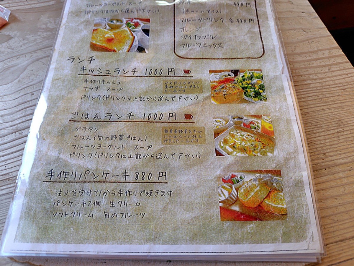 ランチメニューは「キッシュランチ」と「ごはんランチ」の2種類で、その他にパンケーキセットもあるようです。