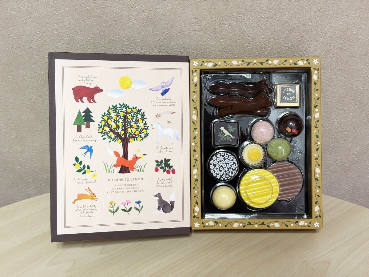 「キツネとレモン」のイラストを楽しめる絵本のようなパッケージとチョコレートがキュートです。