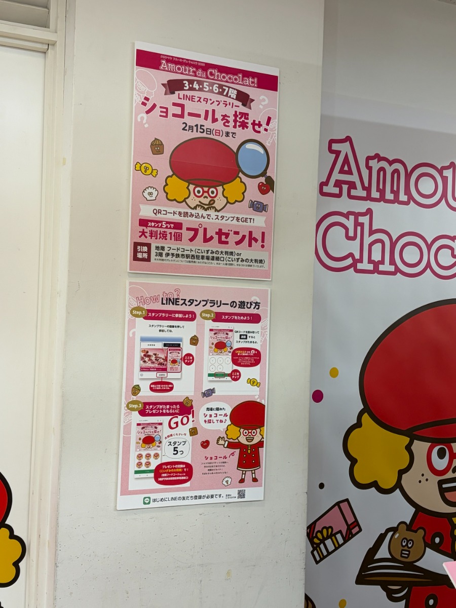 いよてつ髙島屋の3・4・5・6・7階でショコールを探して、スタンプ5つ集めると大判焼1個をプレゼントしてくれるそうです。