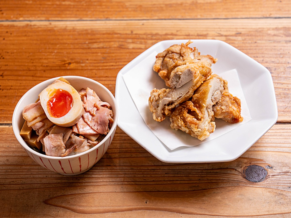 ラーメンにプラスできる「満腹セット」。大きな唐揚げ2個と「肉めしミニ」が付いた人気のセット