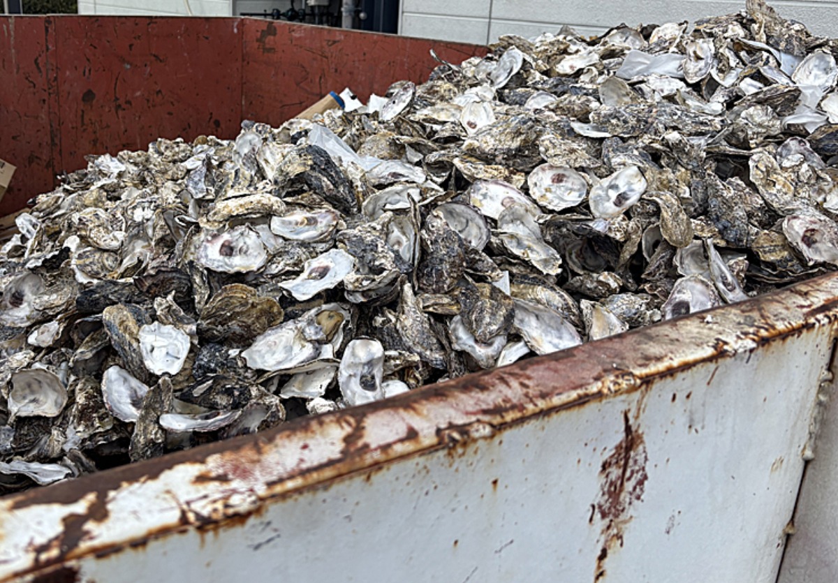 駐車場には、バッカンが置かれてあって、中は山のような牡蠣の殻。