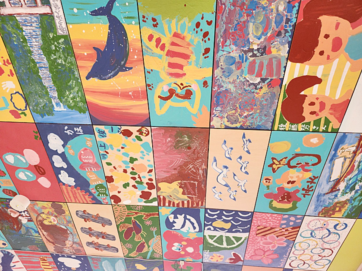 施設の天井にはたくさんのアートが。寝転んでみるのもオススメ♪