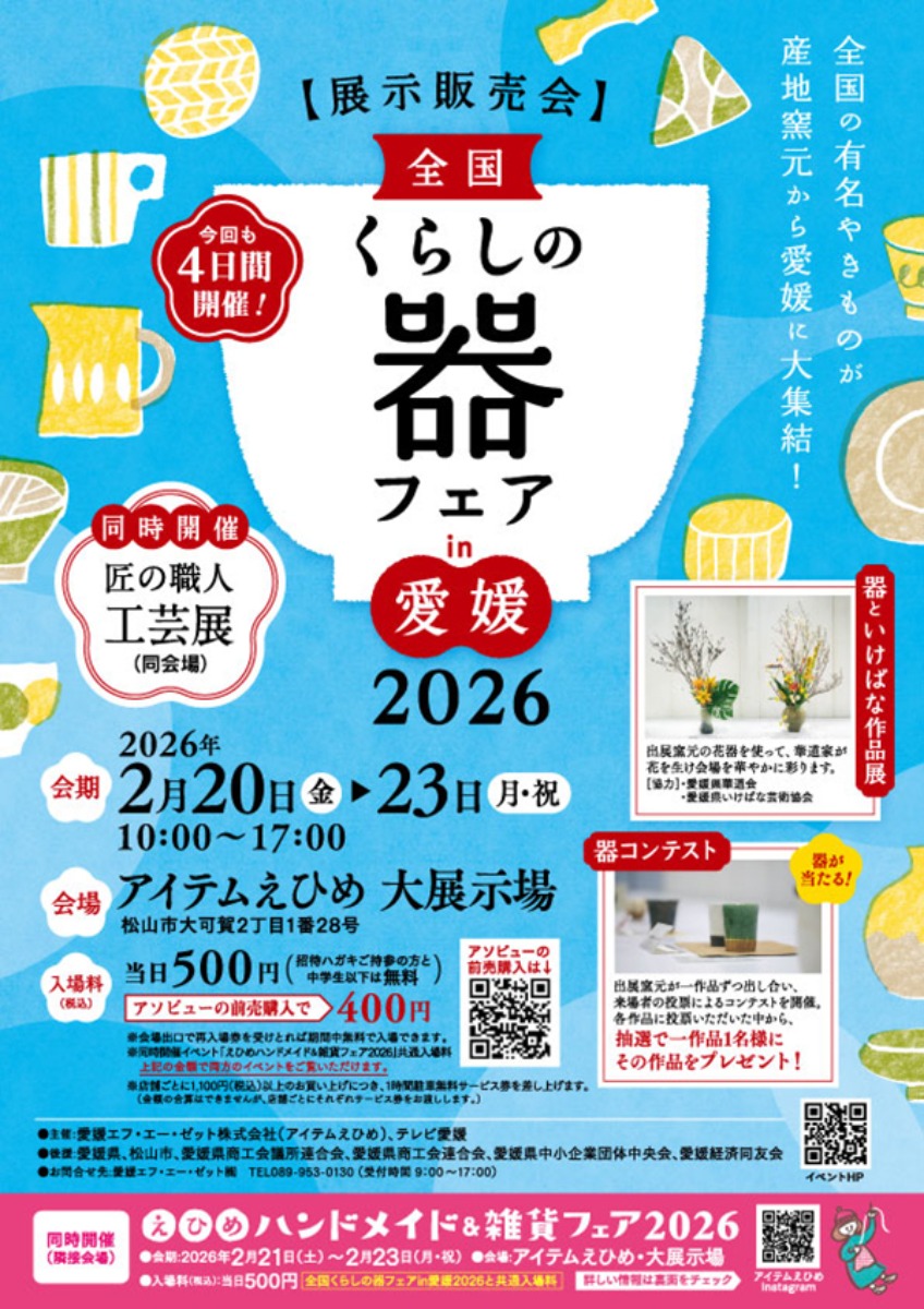 【全国くらしの器フェアin愛媛2026】全国のやきものと手しごと工芸品が集う特別な出会いの4日間! 暮らしを彩る器の展示即売会と多彩な催しを楽しもう(愛媛/松山市)