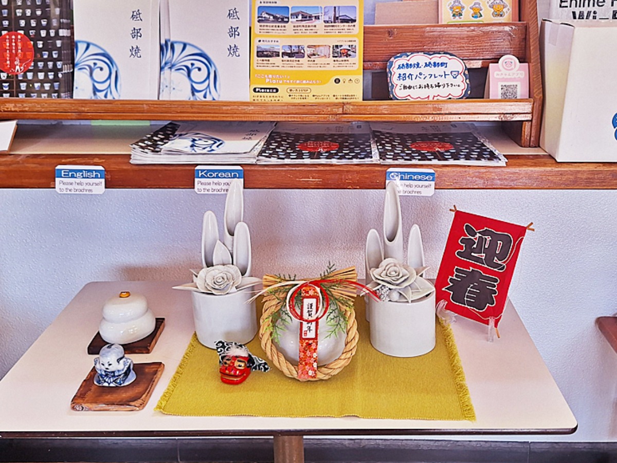 1月ということで、入口には砥部焼で作られた門松や鏡餅などが飾られていました。