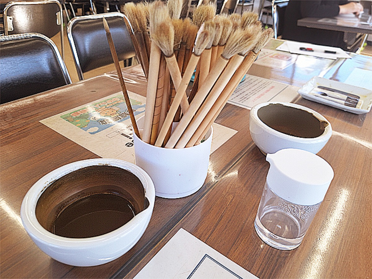 テーブルには、下書き用の鉛筆や絵付け用の筆など、必要な道具が揃っています。