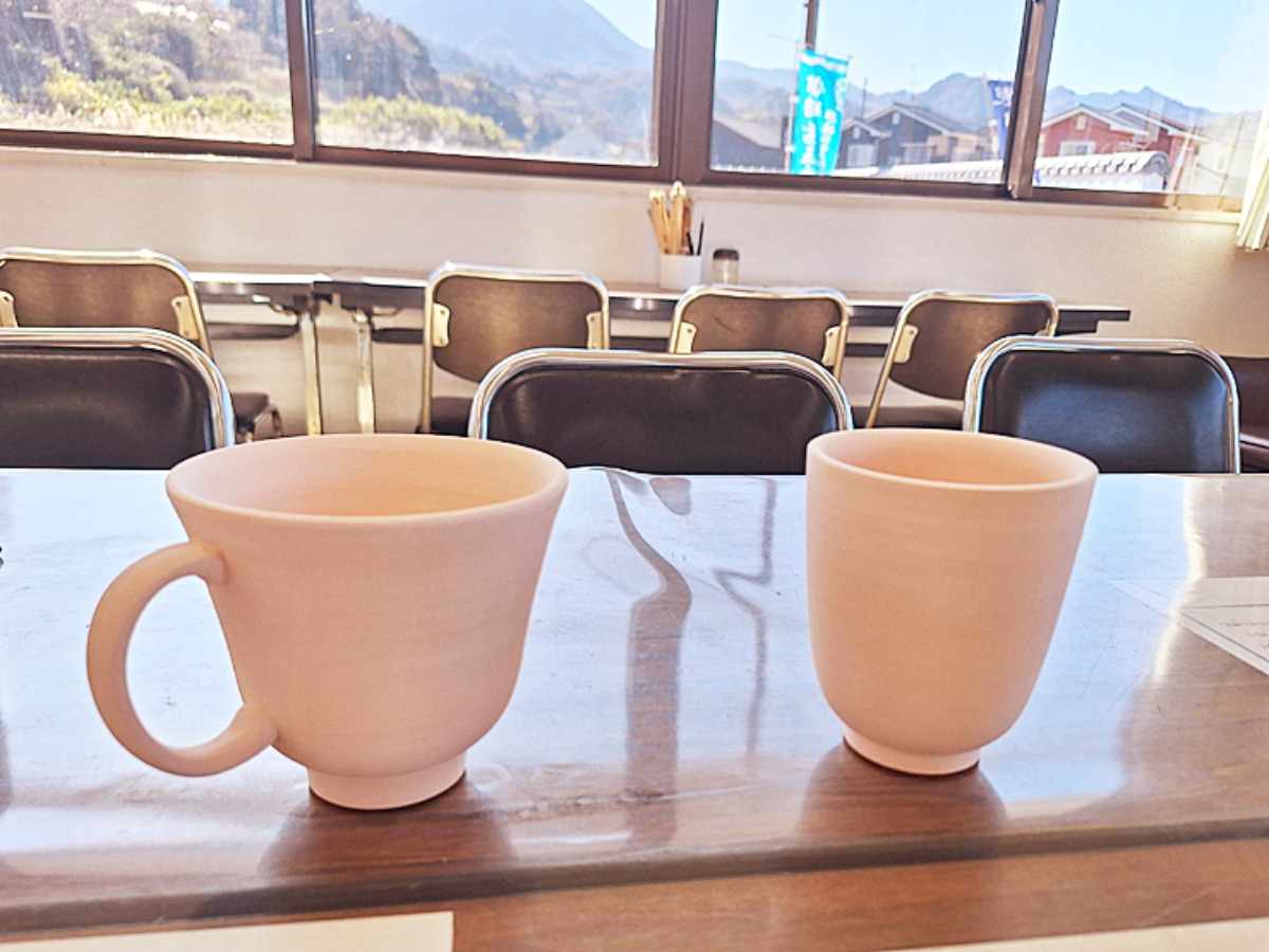 前回のろくろ体験で作ったマグカップ(左:うさりん作)と湯呑み(右:うさのん作)