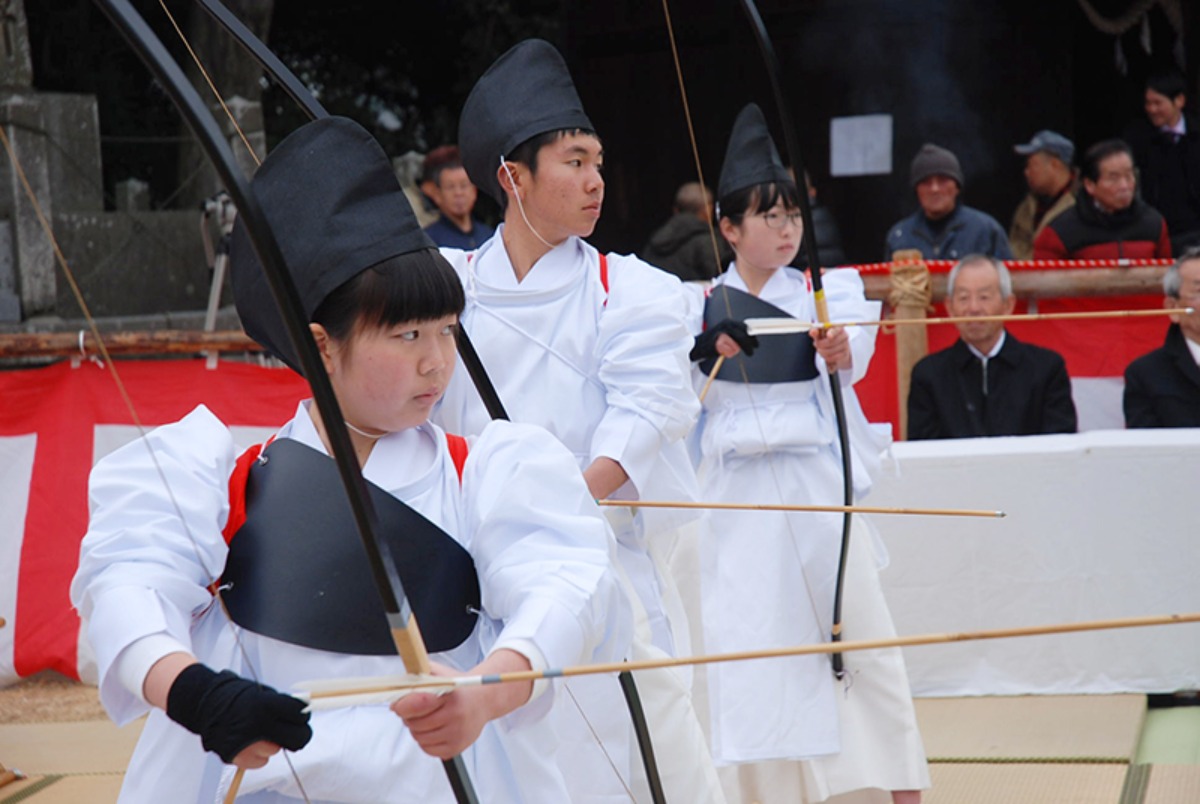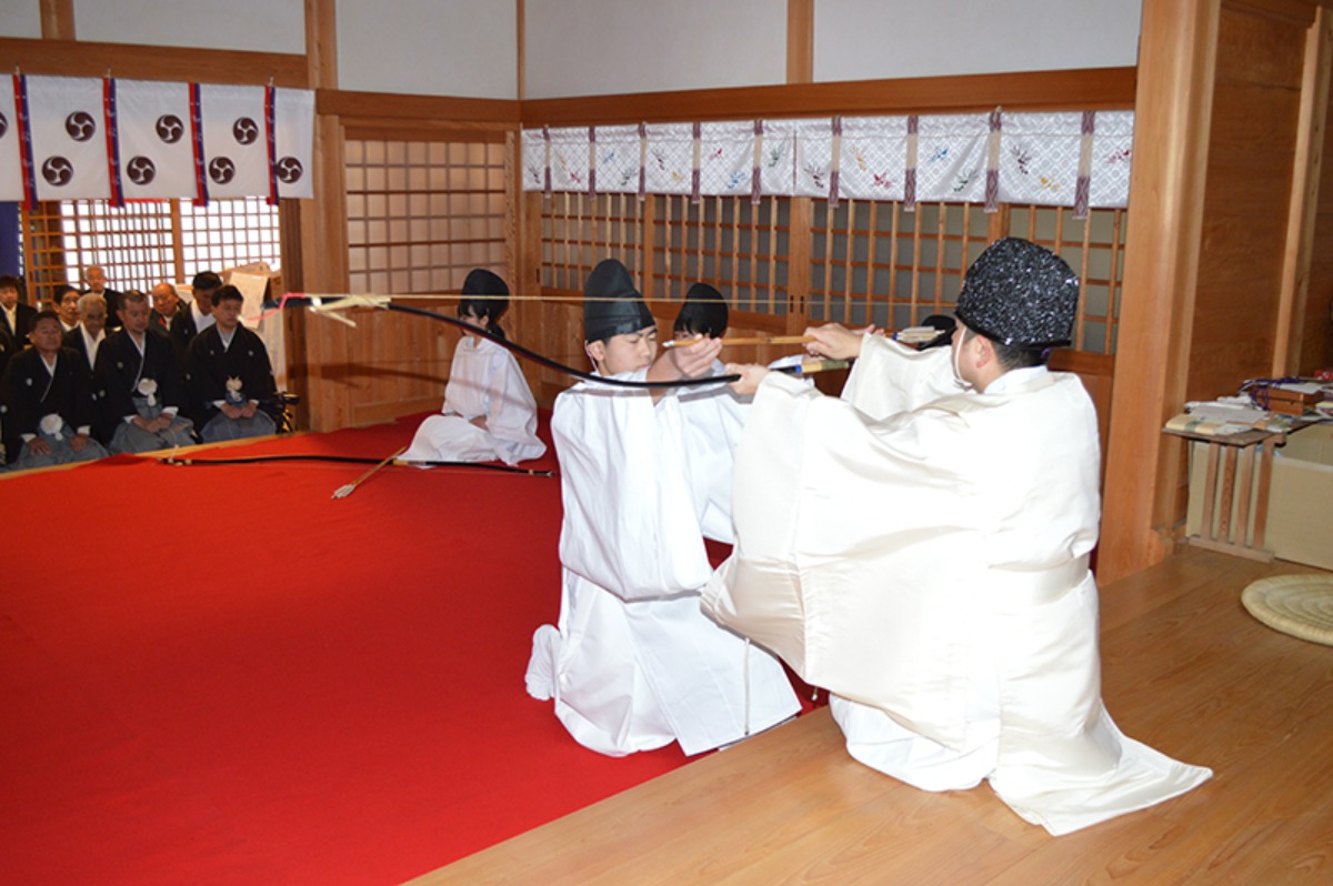 時を超えて受け継がれてきた神事は、建国記念の日の2月11日に開催され、静かな冬の境内に弓矢の響きが厳かに響き渡ります。