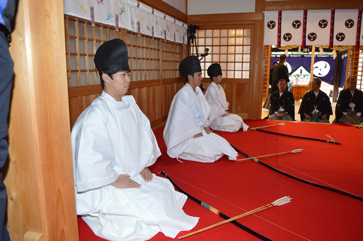 当日は社務所での厳粛なお祓いから始まり、白装束と烏帽子の射手たちが神殿で弓矢を供え、神聖な祈祷を受けます。