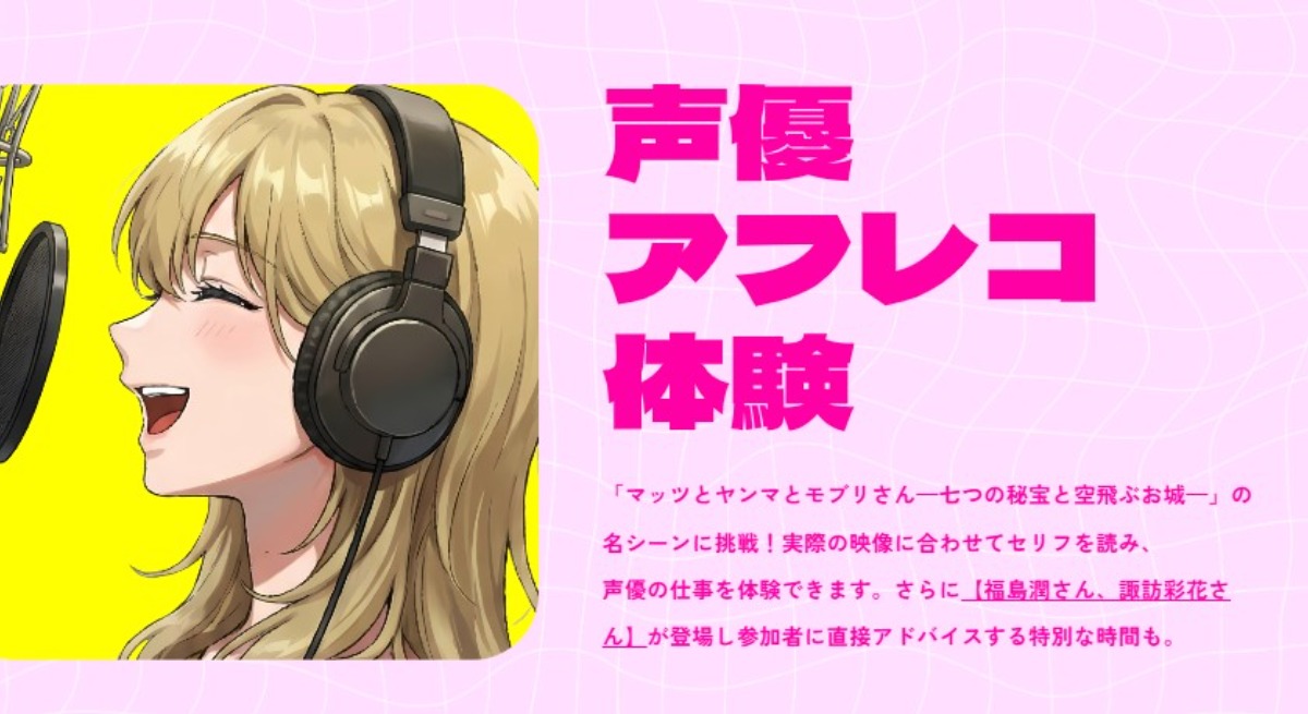 アニメの名シーンに自分の声を吹き込む本格体験。福島潤さん、諏訪彩花さんが直接アドバイスしてくれる特別企画もあります。