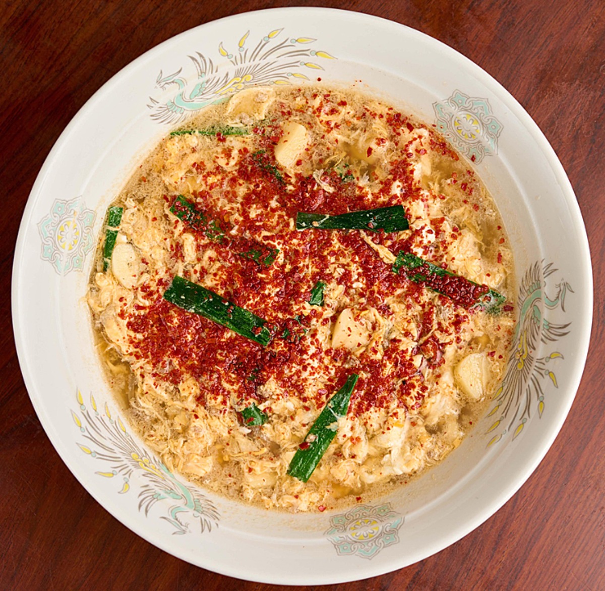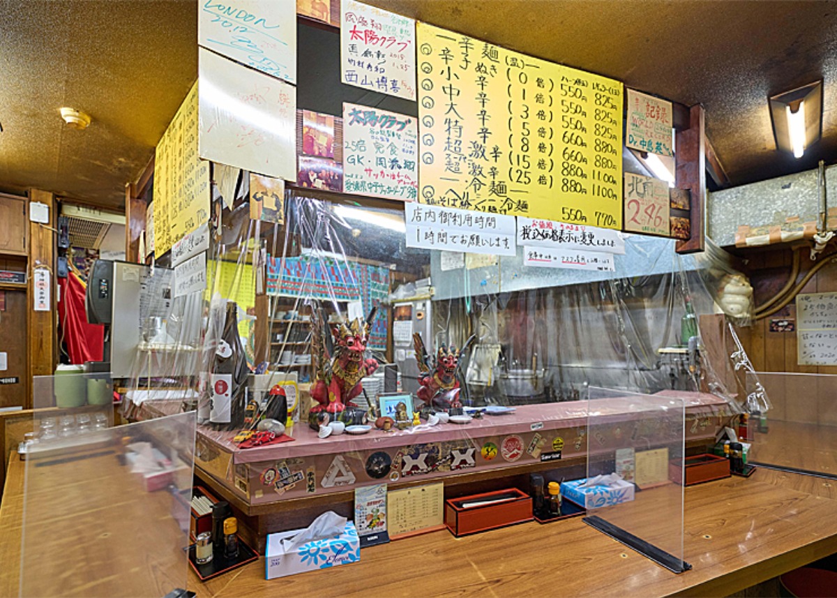 看板メニューの「元祖辛麺」は、鶏ガラや牛ダシの旨みに、豚肉やニンニク、溶き卵が加わったコク深いスープが特長。