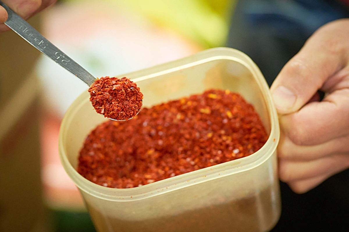 辛麺の辛さを決める、仕上げに振りかける粗挽き唐辛子は1杯 =1倍の辛さ。つまり、辛さ25倍 はスプーン25杯分ということ!
