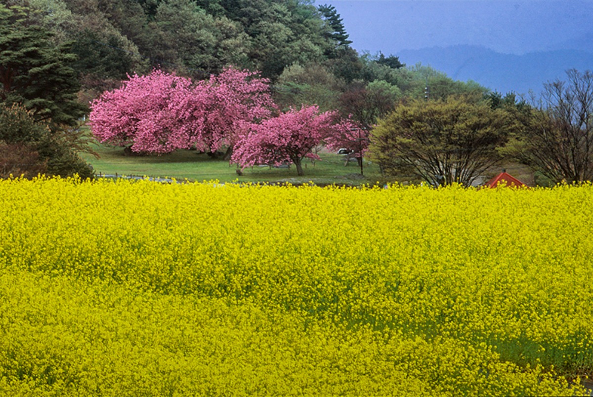 桜の時期には、黄色とピンクのコントラストが花見客の目を楽しませてくれます。桜と菜の花を同時に見られるのも「翠波高原」の魅力の一つ。