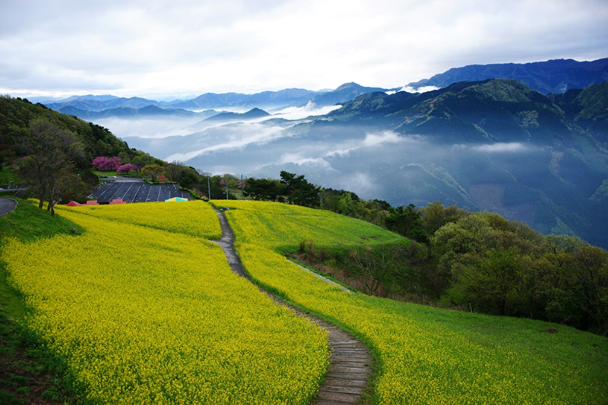 春の「翠波高原」には、約30万本の菜の花が咲き誇ります。一面が黄金色の菜の花で覆い尽される光景は圧巻。
