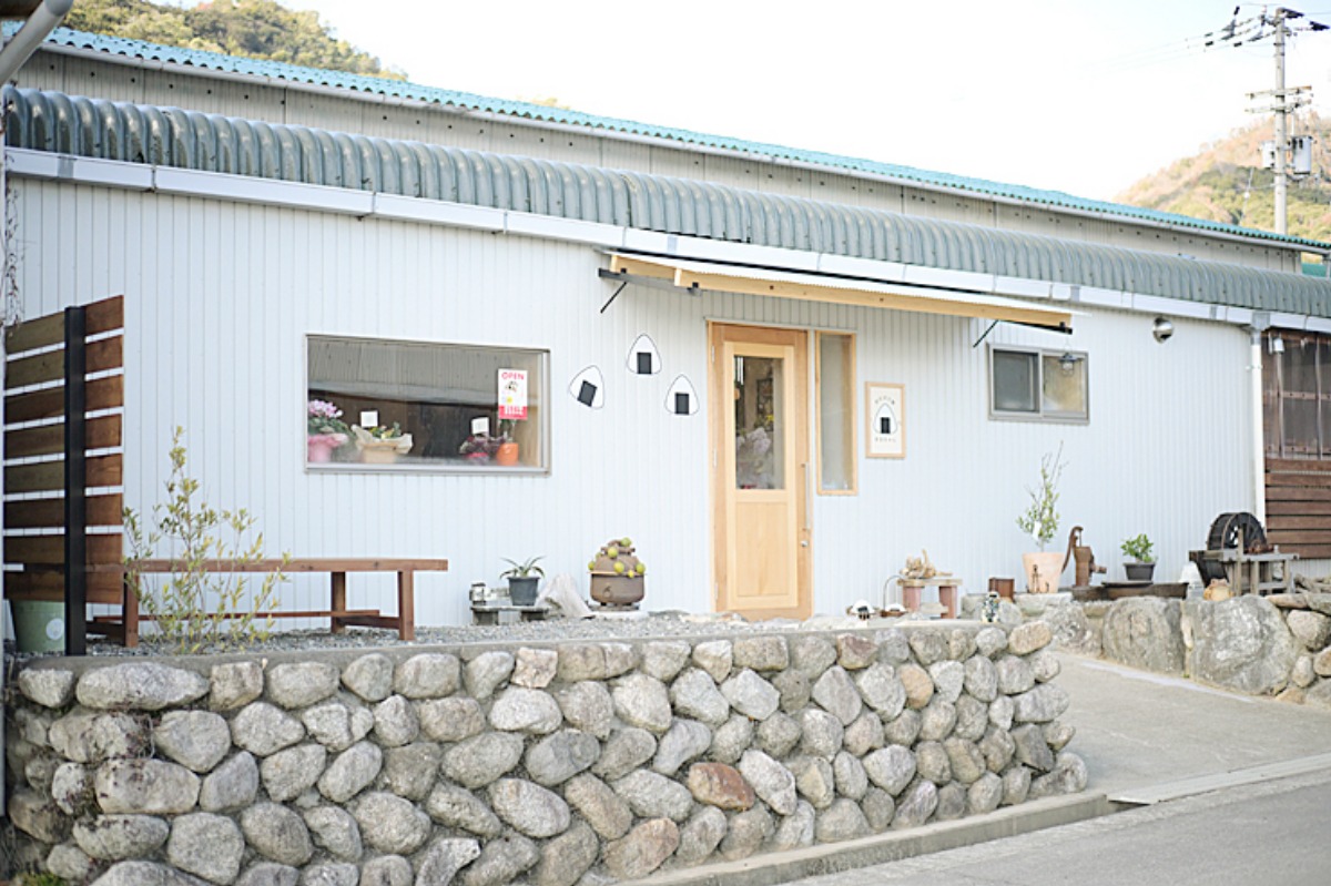 倉庫を改装したお店は、おにぎりを連想する白い壁面が特徴。