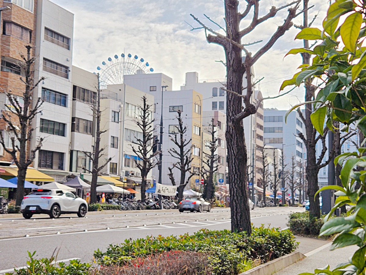 ここは近年まちづくり開発が進んでおり、6車線あった車道を2車線まで減らして歩道を広く設けています。